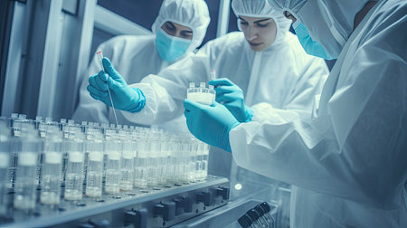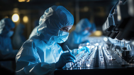 Team of professionals in protective cleanroom suits conducting research in a modern high-tech laboratory.