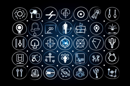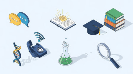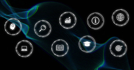 Hovering icon cluster floating over digital art background, with information and analytics symbols. Futuristic, technological, innovative, abstract, data, connectivity, education