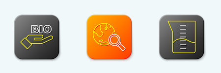 Set line Bio healthy food Magnifying glass with globe and Laboratory glassware or beaker icon. Vector.