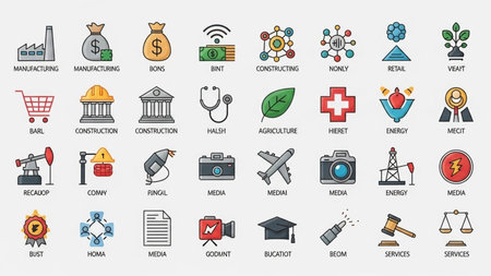 This image displays a collection of various business and industry icons, representing different sectors such as manufacturing, retail, healthcare, media, and more. Each icon is designed to symbolize a specific industry or profession.