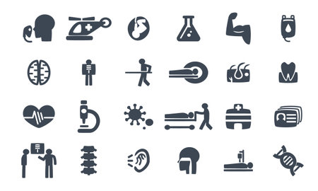 Set of hand drawn black icons depicts medical and scientific themes like syringe, virus, microscope, droplets, and checklist with a simple line art style for education or presentations.