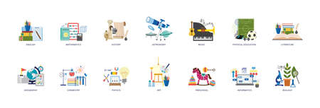 Education icons of school lesson subjects set of flat vector illustration isolated on white background. School and preschool classes symbols and signs bundle.