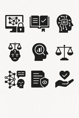 Various icons representing technology, education, and ethics, illustrating interconnected concepts in digital literacy and decision-making standards in modern society