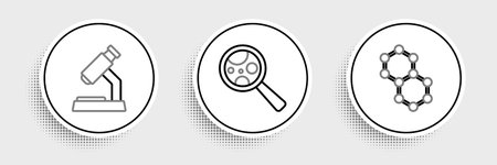 Set line Molecule Microscope and Microorganisms under magnifier icon. Vector.