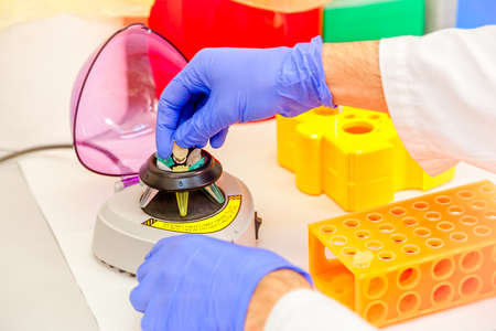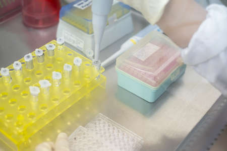 Scientist working with a pipette and a flask, in plastic tubes for DNA studies. Concept of science, laboratory and study of diseases.