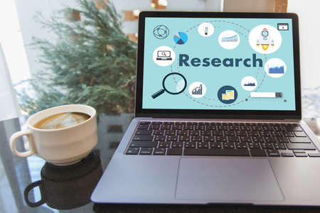 Top view of notebook, magnifying glass and square letters with text RESEARCH.