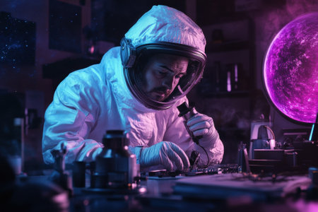 An astronaut in a white suit works diligently in a high-tech lab filled with advanced equipment.