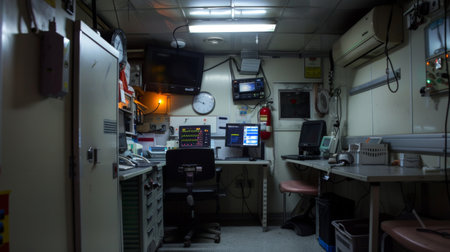 A dimly lit control room with multiple computer screens displaying data and graphs