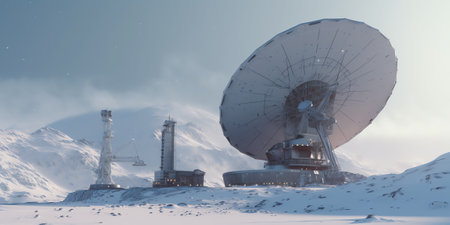 A lone communication tower stands as a beacon of connectivity amidst the vast, frozen expanse of the Arctic.