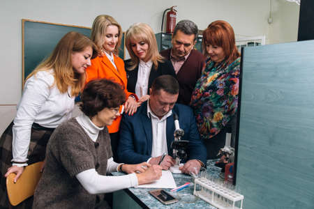 LUTSK, VOLYN / UKRAINE - November 11, 2017: Group of school teachers posing with microscope at laboratory