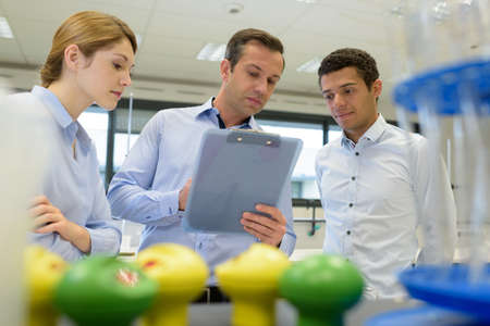 Young chemistry students in a sterile laboratory environment are enjoying observing colorful chemical reactions. Science, chemistry, lab, people