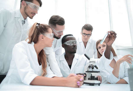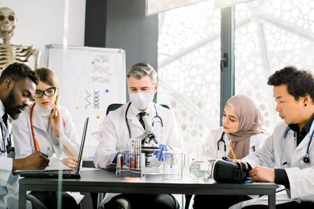 Medicine, genetics, immunology, microbiology concept. Multiethnic group of scientists, Caucasian man and woman, Muslim woman, working at the laboratory with microscope, tubes with liquids and laptop.