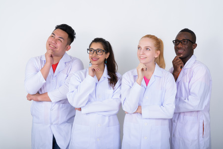 Studio shot of happy diverse group of multi ethnic doctors smili