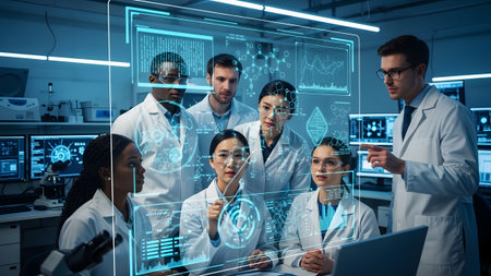 Diverse scientists collaborating on advanced holographic data in a high-tech research laboratory