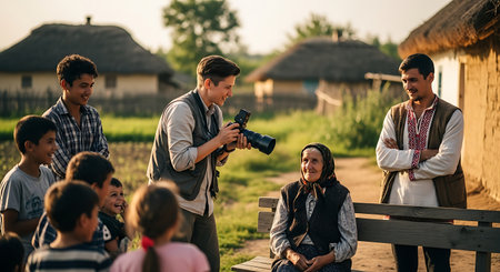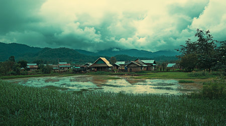 Cinematic view of a quaint village nestled in the serene hills at twilight