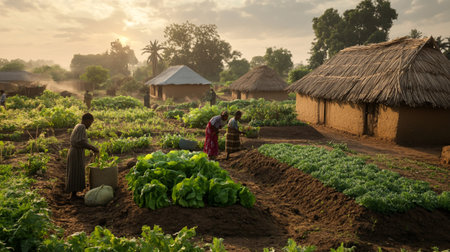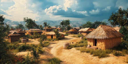 A group of African villagers walk down a dirt path in their village, carrying baskets and heading towards their homes. The scene depicts the simple yet meaningful life within a traditional African community.