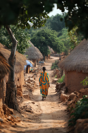 A woman dressed in vibrant traditional clothing strolls along a dusty pathway in a rural village. The path is flanked by humble mud huts with thatched roofs, nestled among lush greenery, creating a serene atmosphere.