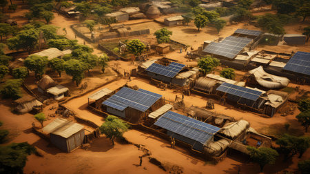 Top view of a quiet African village with thatched roofs, offering open space for text