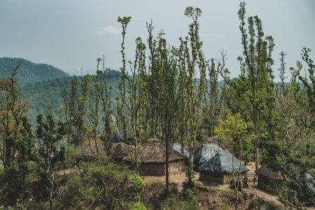 ALMORA, INDIA - SEPTEMBER 02, 2020: An Indian rural village in UTTRAKHAND with mud huts, poultry and people roaming in the courtyard.