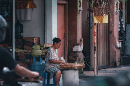 KUTA, BALI, INDONESIA-APRIL, 2020: Indonesians locals and street market employees sell souvenirs, cheap clothes, and food. Environment and society. Poverty and cheap goods. Travel to Asia.