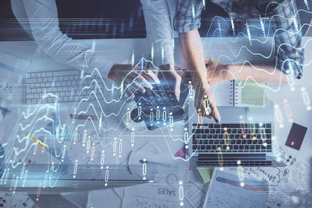 Multi exposure of man and woman working together and forex graph hologram drawing. Financial analysis concept. Computer background. Top View.