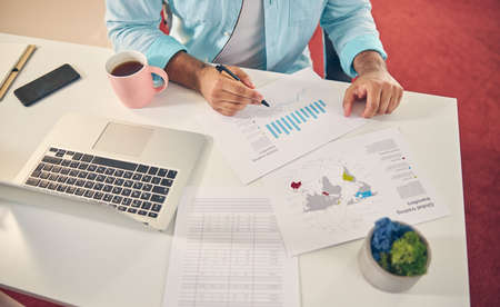 business documents graphs. laptop hands holding papers. report statistics data analysis. office workplace