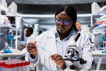 Histology technician in laboratory pipets agent into blue test tube sample to improve chemical formulation efficiency. Lab staff member observes reaction in test tube to verify scientific hypothesis