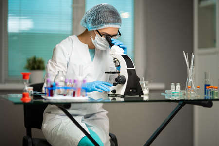 Scientist works with dangerous substances. Chemist in a protective suit looks through a microscope. Lab assistant sits against the background of test tubes and a microscope next to the place for text