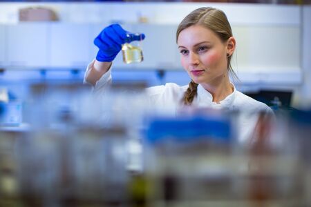 Young female scientist looking at sample in lab
