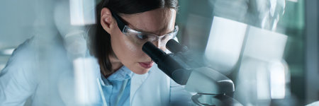 Young female Caucasian researcher using modern microscope while working in chemical laboratory late at night, header