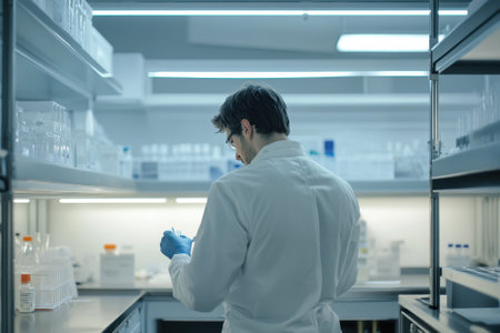A researcher in a lab coat examines samples while working in a well-lit laboratory space.