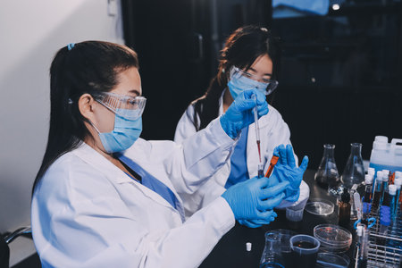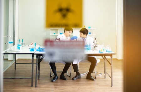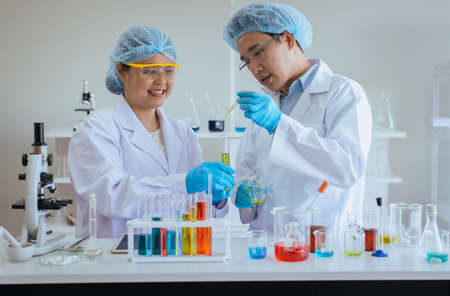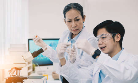 Two asian scientist team reserch chemistry science tube experiment biotech antibody sample in laboratory Cultivate Vaccine against covid-19 virus. Scientist consult, analyze in Chemistry Laboratory