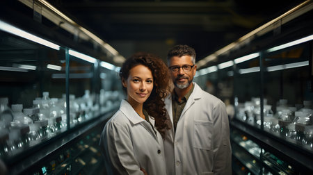 Professor and his young and professional laboratory assistant are doing scientific experiment in a modern laboratory. Genetic engineers workplace. The concept of science, medicine and vaccine.