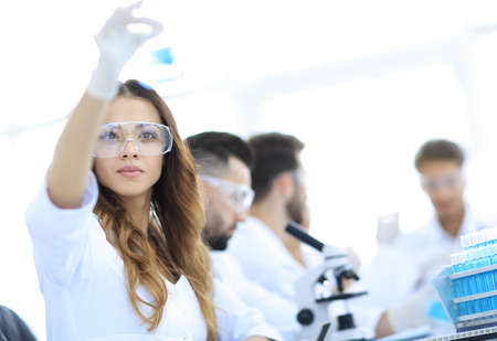group of scientists examines the liquid in the flask.