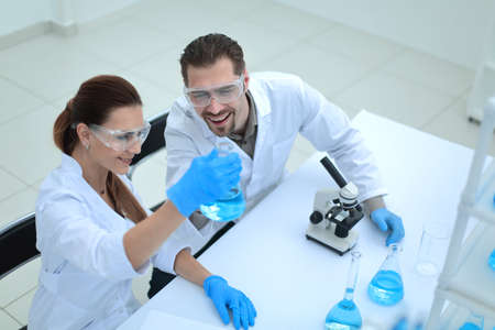 scientists working with test tubes and microscope in the laboratory