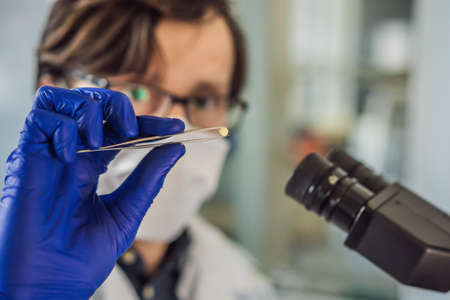 Researcher wearing protective mask and gloves looks through microscope. Research and development of new vaccines concept