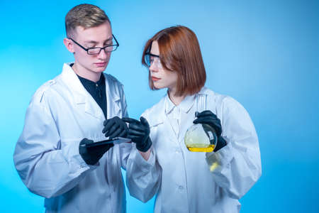 A girl and a young man conduct chemical experiments. Two of the student-the chemist. Comparison of experimental results with control values. Laboratory assistants with a flask and a tablet PC.