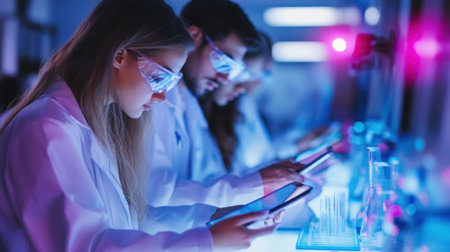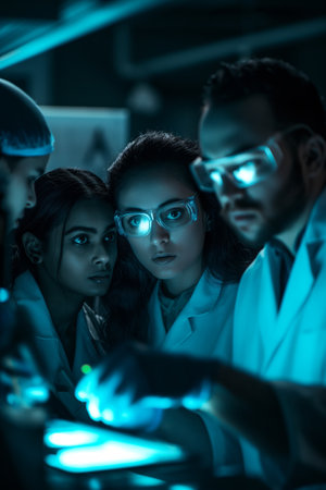 Scientists Collaborating in HighTech Laboratory with Blue Lighting.