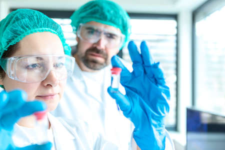 Two scientists are working holding looking at test tube with sample in a chemistry lab scientist or young female and male researcher are doing investigations in Laboratory analysis background