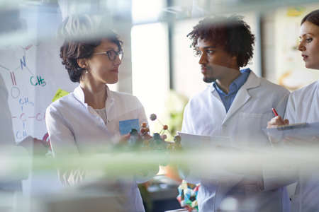 Young colleagues listen to about chemical bonds explained on a model in a working atmosphere in the university laboratory. Science, chemistry, lab, people
