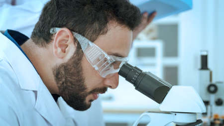 Close up scientist use microscope in the lab. Biotechnology researcher scientist working look microscope in the medical development laboratory for vaccine development
