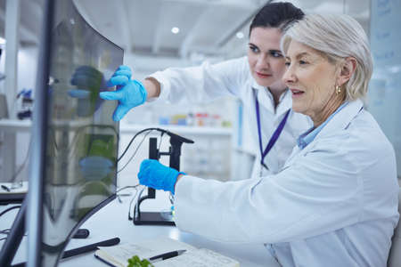 Close up portrait of two female scientists examining plant samples while working in biotechnology lab, copy space
