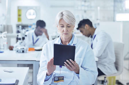 making the time for work. a mature female scientist working on her digital tablet in the lab.