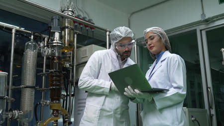 Two scientist in professional uniform working in laboratory for chemical and biomedical experiment