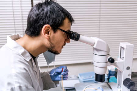 Stock photo of male scientist wearing face mask using a microscopy in his lab.