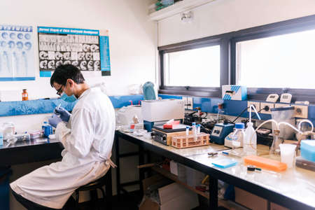 Stock photo of male scientist wearing face mask working in his laboratory.