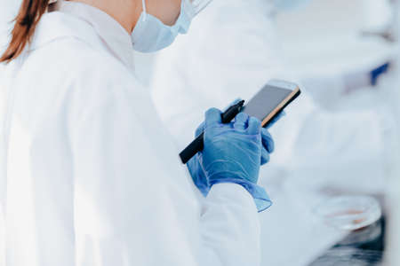 close up. female scientist looking at the screen of her smartphone.