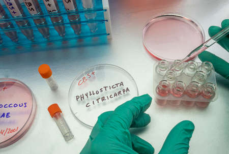 Samples of a tiny fungus in oranges called Phyllosticta citricarpa or black spot, it is a pest especially present in South Africa, petri dish contains residues, conceptual image