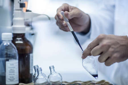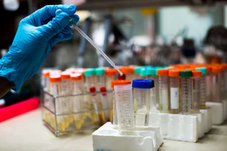 Stock photo of unrecognized scientist filling test tubes in the laboratory.