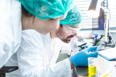 Doctors in the laboratory analyze samples under a microscope. Pharmaceutical treatment concept